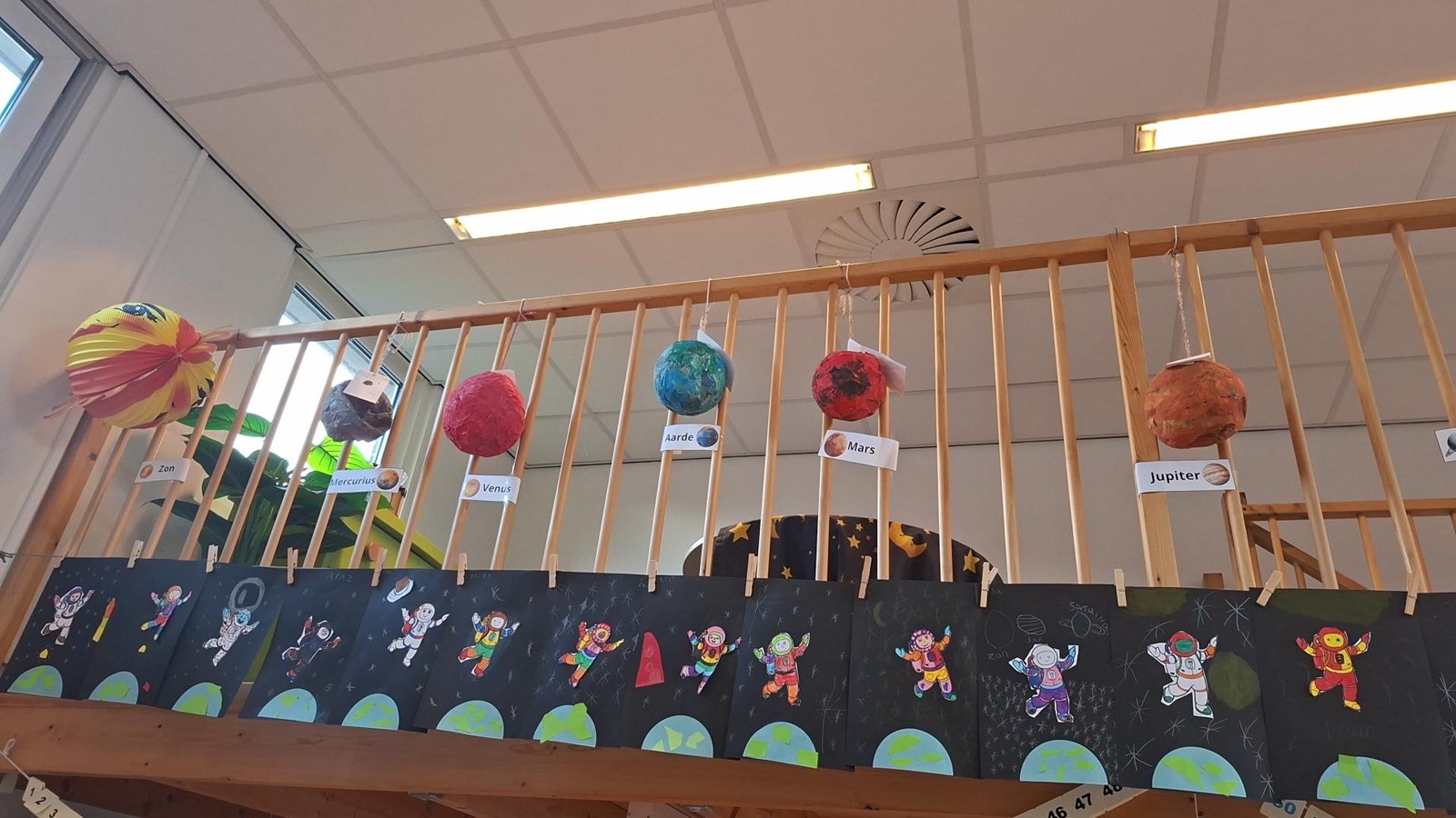 In de groepen 4 werken we aan het thema ”ruimte”. We hebben planeten gemaakt van papier maché en ook maakten we een ruimtetelefoon die echt werkt! 🚀🪐