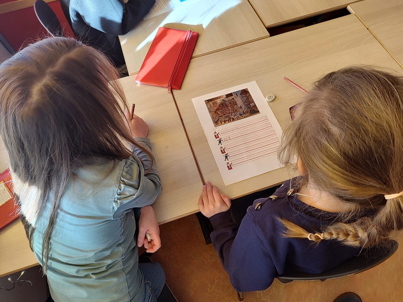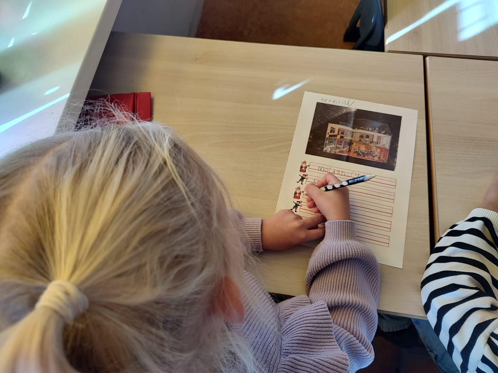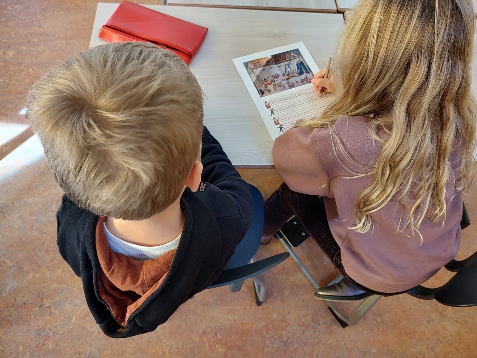 De kinderen van groep 3 gingen in tweetallen aan de slag met een Sinterklaasopdracht. Ze kozen een afbeelding en verzonnen daar samen een verhaal bij. ๐