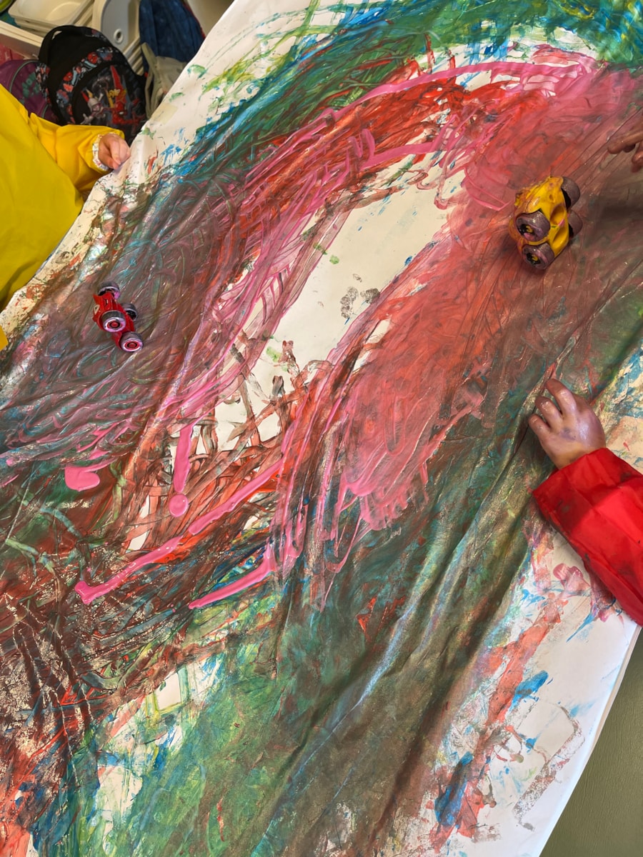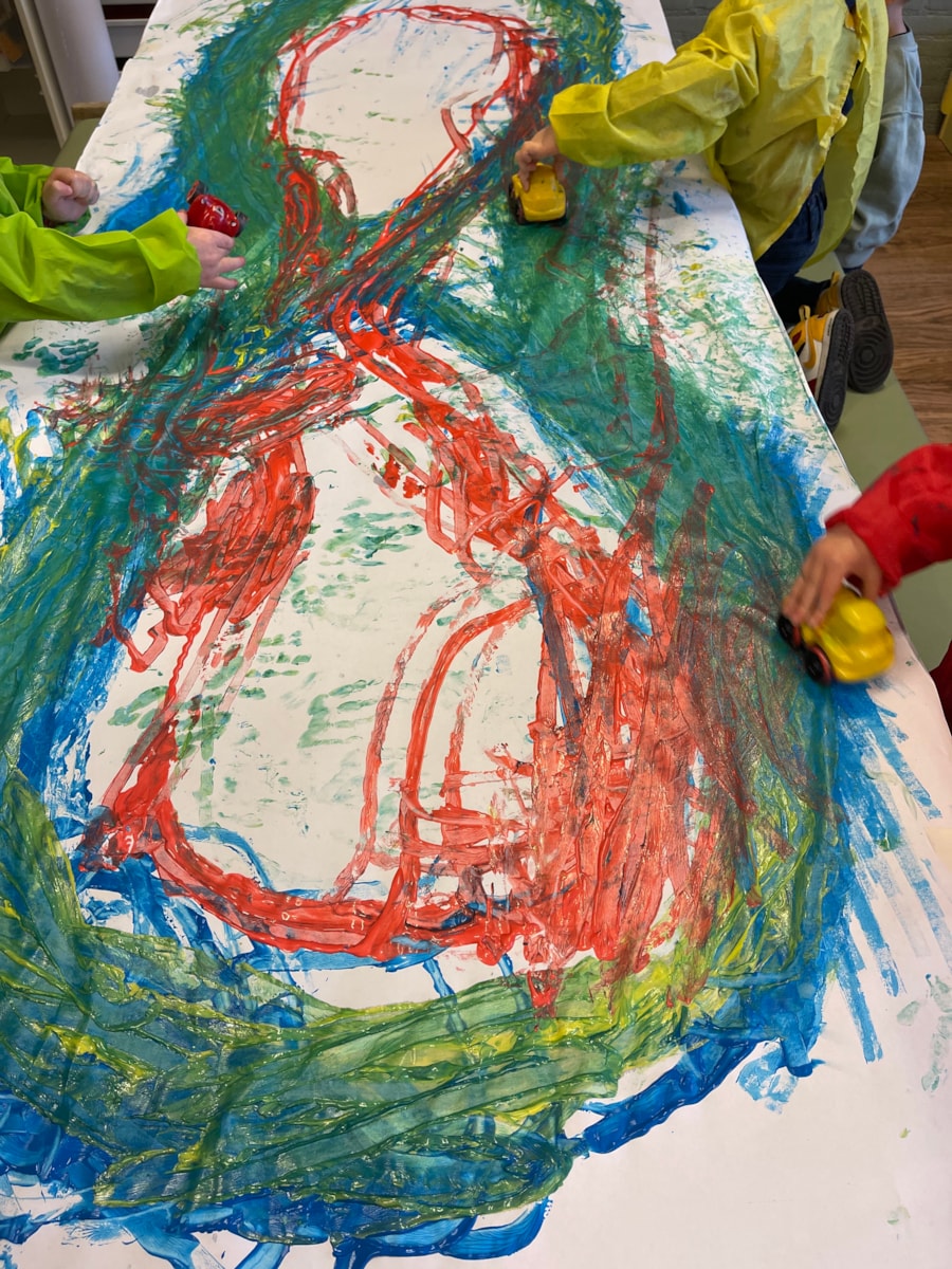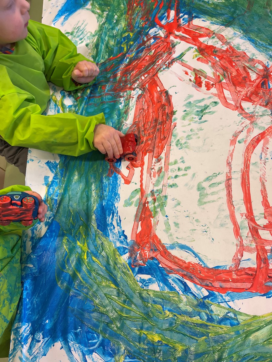 De peuters mochten deze week met auto’s sporen maken op een groot vel papier. We hebben allemaal verschillende kleuren verf gebruikt. 🚗🎨