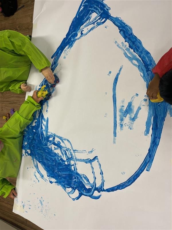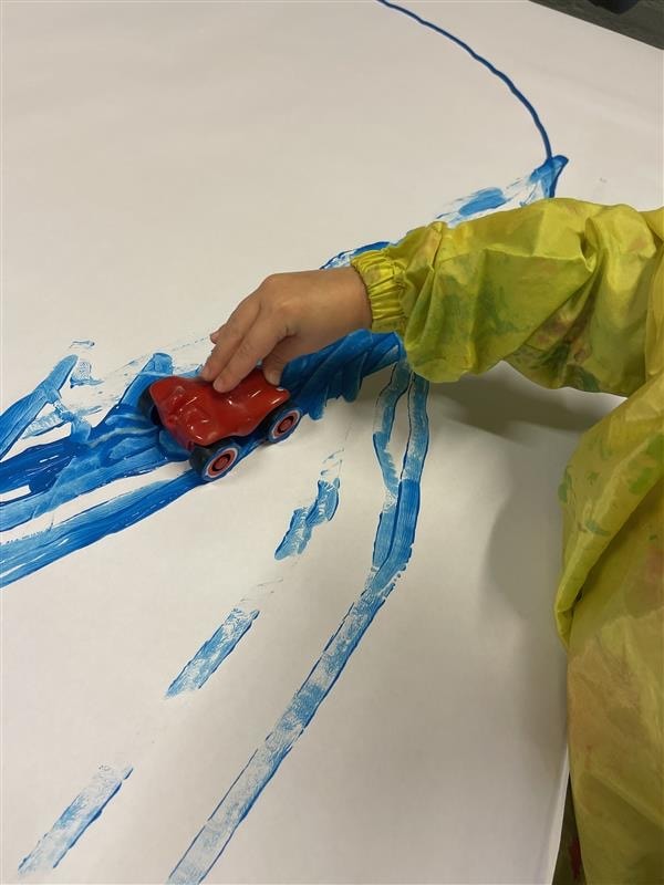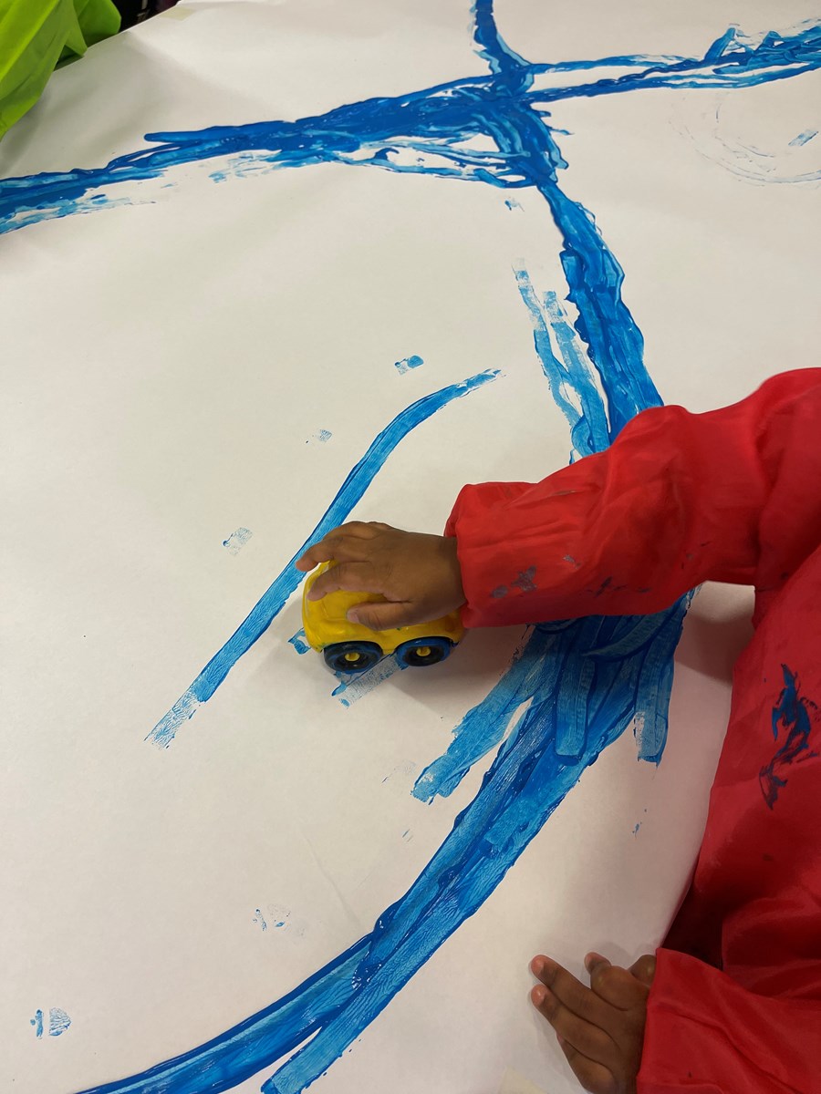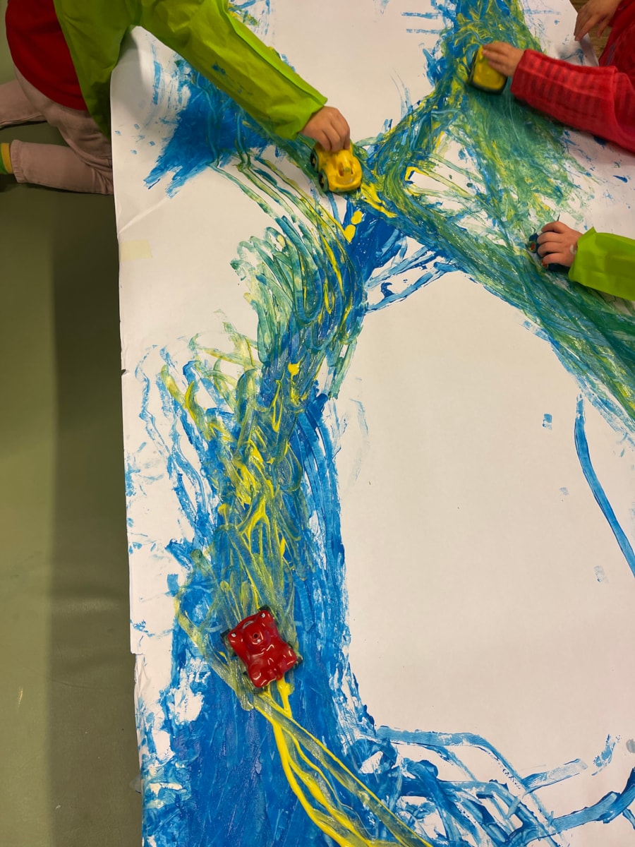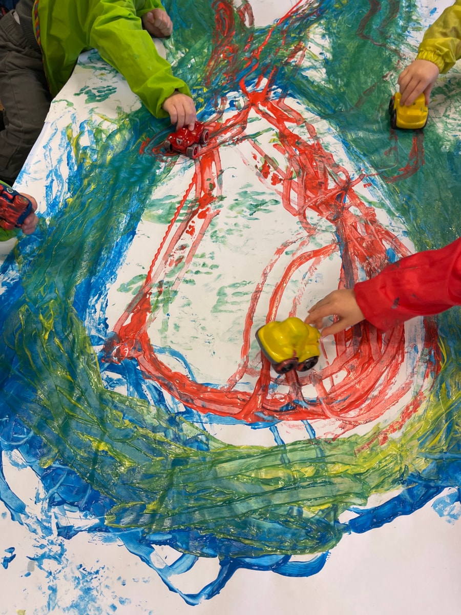 De peuters mochten deze week met auto’s sporen maken op een groot vel papier. We hebben allemaal verschillende kleuren verf gebruikt. 🚗🎨